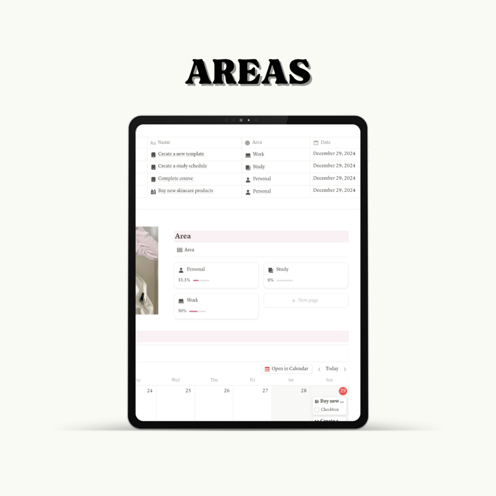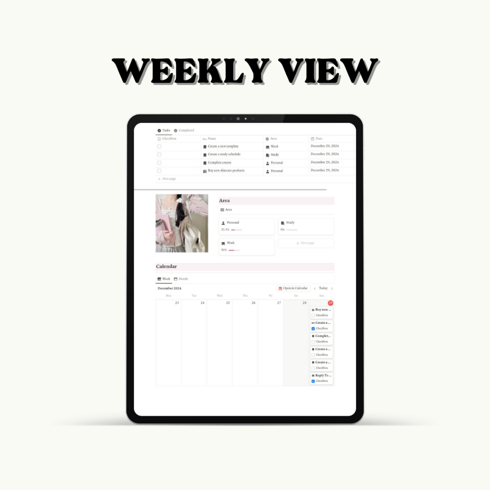 This template is designed to help you effectively manage your tasks across different areas of your life. With an intuitive layout featuring both weekly and monthly calendar views, this template allows you to visualize your commitments and track your progress effortlessly